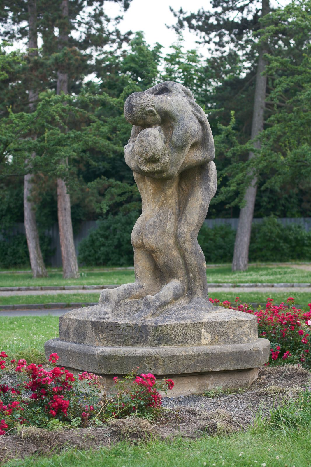 Sousoší s názvem Polibek, akt objímající se milenecké dvojice, vzniklo roku 1921 podle sádrového modelu sochaře Josefa Mařatky (1910). Až do počátku 50. let minulého století stávalo v Letenských sadech, na místě bývalého pomníku korunního prince Rudolfa. V roce 1951 bylo sousoší přemístěno na současné místo, do petřínských růžových sadů.