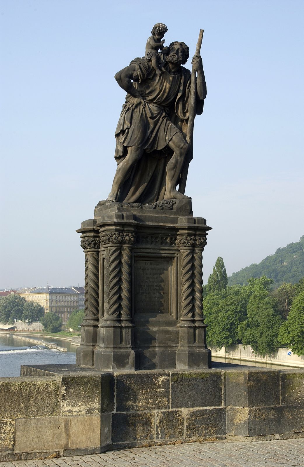 Sochu sv. Kryštofa, patrona cestovatelů, řidičů a plavců a ochránce při bouřích a povodních, nechali zástupci pražského duchovenstva a pražský purkmistr Václav Vaňka osadit na místě vojenské zbrojnice, která se při povodních roku 1784 i s vojáky zřítila do řeky. Sochu provedl roku 1857 pražský sochař Emanuel Max. Prostředky byly získány ve veřejné sbírce. Postava světce, kráčejícího s Ježíškem na levém rameni vodou, těžce se opíraje o sukovitou hůl, je mezi díly, osazenými na Karlův most v 19. století, jediným, které zobrazované figury znázorňuje v pohybu a živějším vzájemném kontaktu. Historizující podstavec je v nárožích členěn svazky tordovaných sloupků.