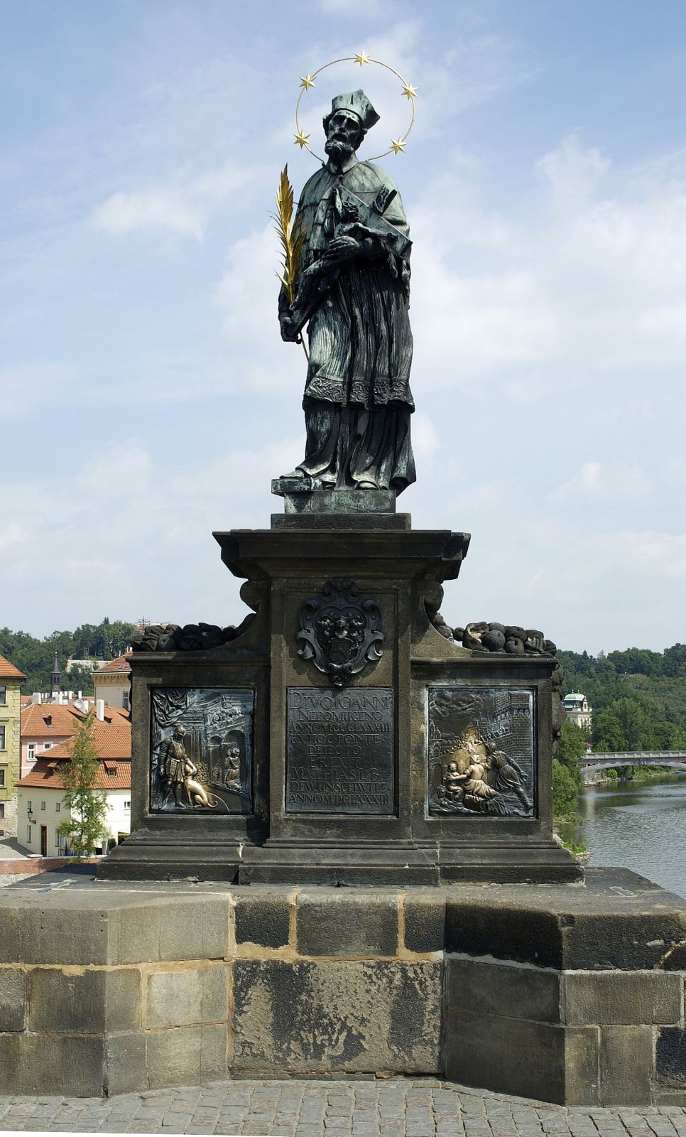 Statue se sv. Janem Nepomuckým je po bronzovém korpusu Krista ze sousoší Kalvárie druhým nejstarším sochařským dílem na Karlově mostě. Objednavatelem a inicátorem jeho vzniku byl Matyáš Bohumír Wunschwitz, jak dokládá bronzová nápisová deska a znaková kartuše s jeho rodinným erbem. Zatímco trojdílný podstavec s charakteristicky převýšenou a předstupující střední částí navrhl významný francouzský, v Praze dlouhodobě usedlý architekt Jean Baptiste Mathey, je bronzová socha dílem Jana Brokoffa. Ten roku 1683 vypracoval dřevěný model, který je dnes vystaven na oltáři kostela sv. Jana Nepomuckého na Skalce, ovšem podle staršího hliněného bozzetta rakouského sochaře Mattiase Rauchmillera (1681, dnes v Národní galerii). Podle Brokoffova dřevěného modelu bronzovou sochu odlila norimberská dílna Wolfganga Hieronyma Heroldta.