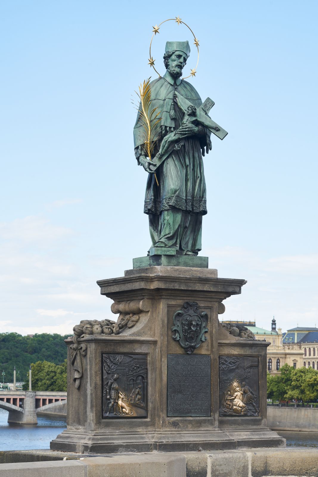 Bronzové reliéfy na bočních dílech podstavce nesou vlevo výjev se zpovědí královny Johany s Václavem IV. se psem v popředí, vpravo pak výjev se svržením sv. Jana do Vltavy (vpravo).