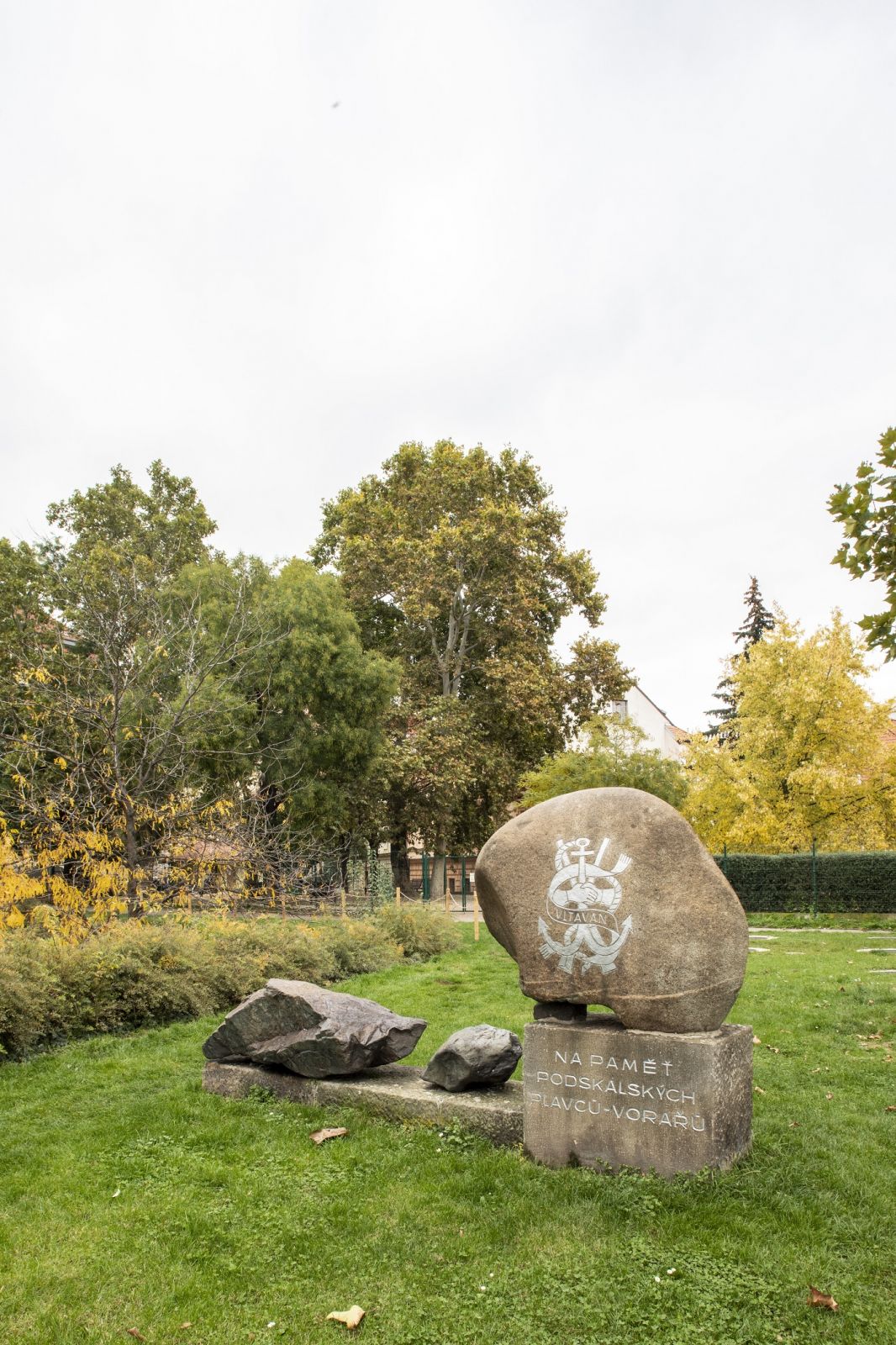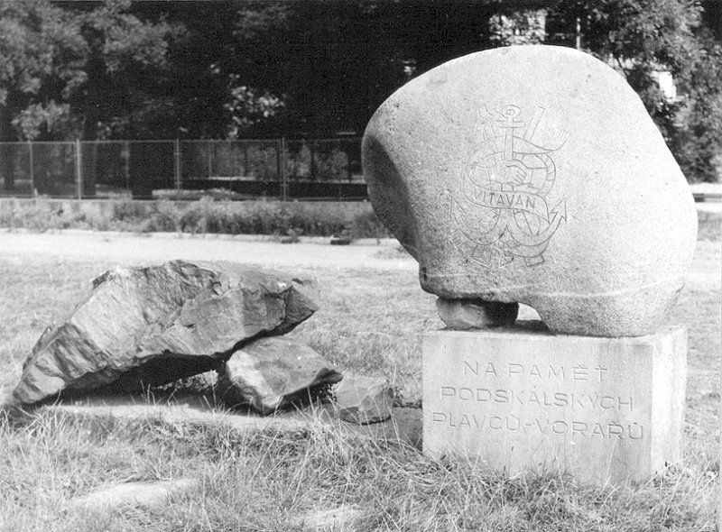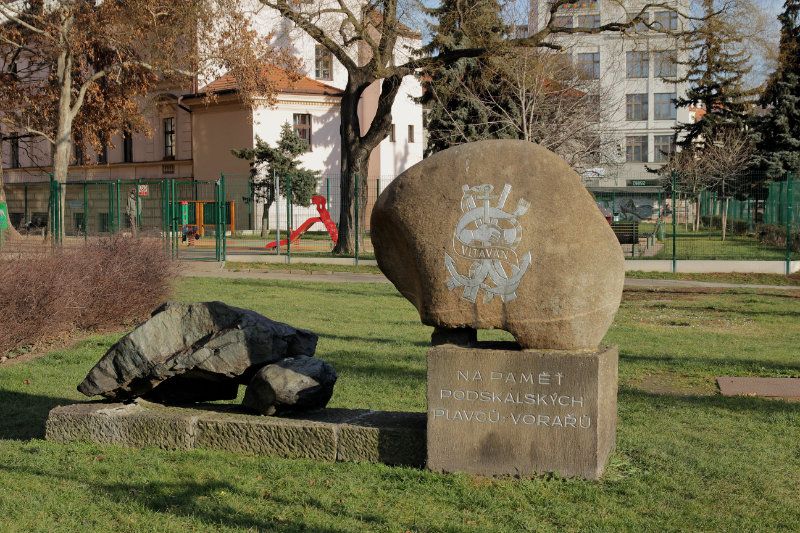 Památník podskalským plavcům či vorařům nechal roku 1971, u příležitosti stého výročí svého založení, zřídit spolek Vltavan. Autorem pomníku byl sochař Jan Jiříkovský. Na kvádrovém pískovcovém soklu je osazen balvan, dovezený z Čertových proudů na horním toku Vltavy. Na něm je vytesán znak Vltavanu podle návrhu malíře Karla Svolinského. Na připojené nízké pískovcové platformě leží další, menší balvany. Pomník byl roku 1976 při výstavbě stoky ze svého původního stanoviště přesunut na stávající místo.
