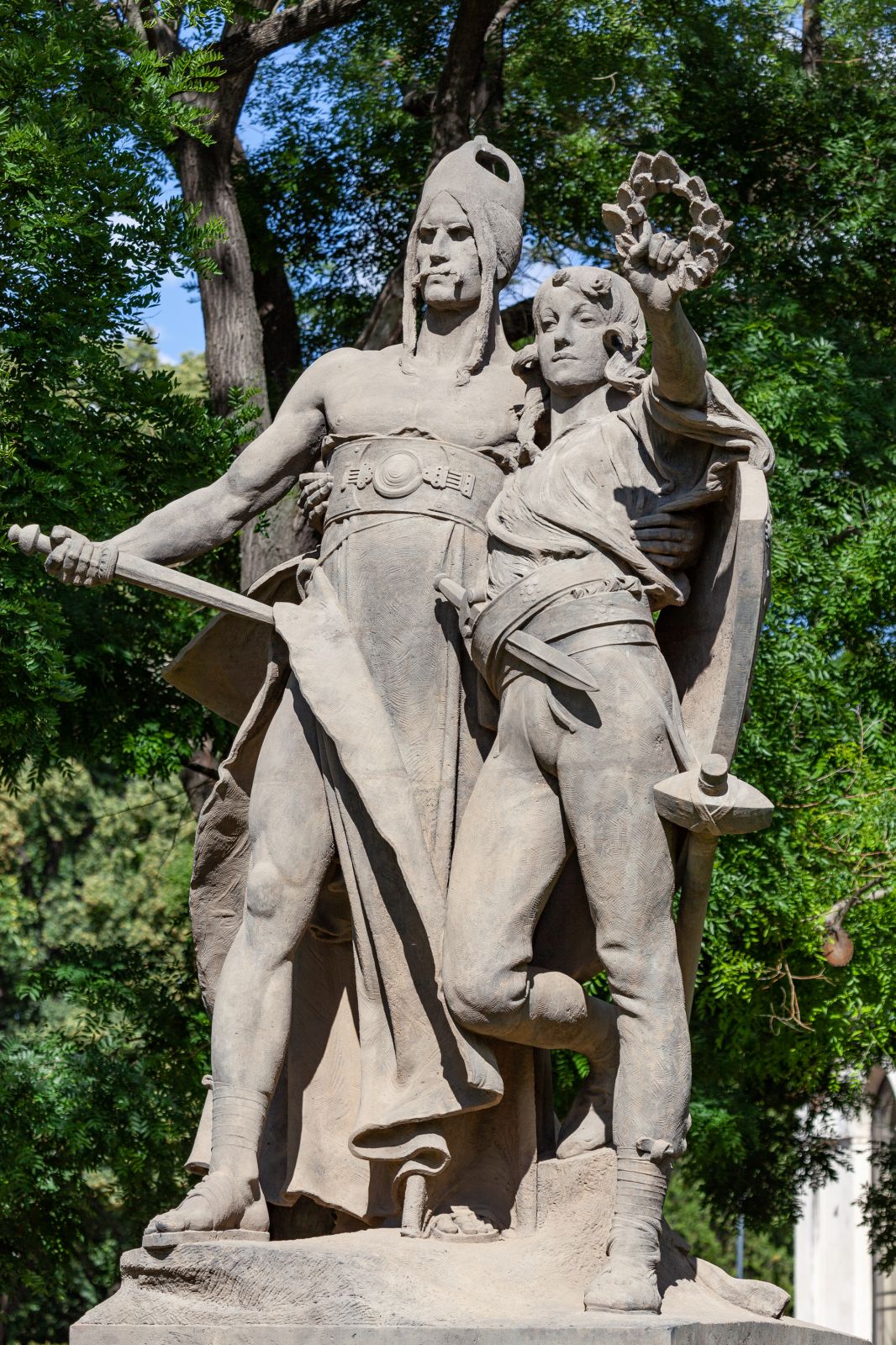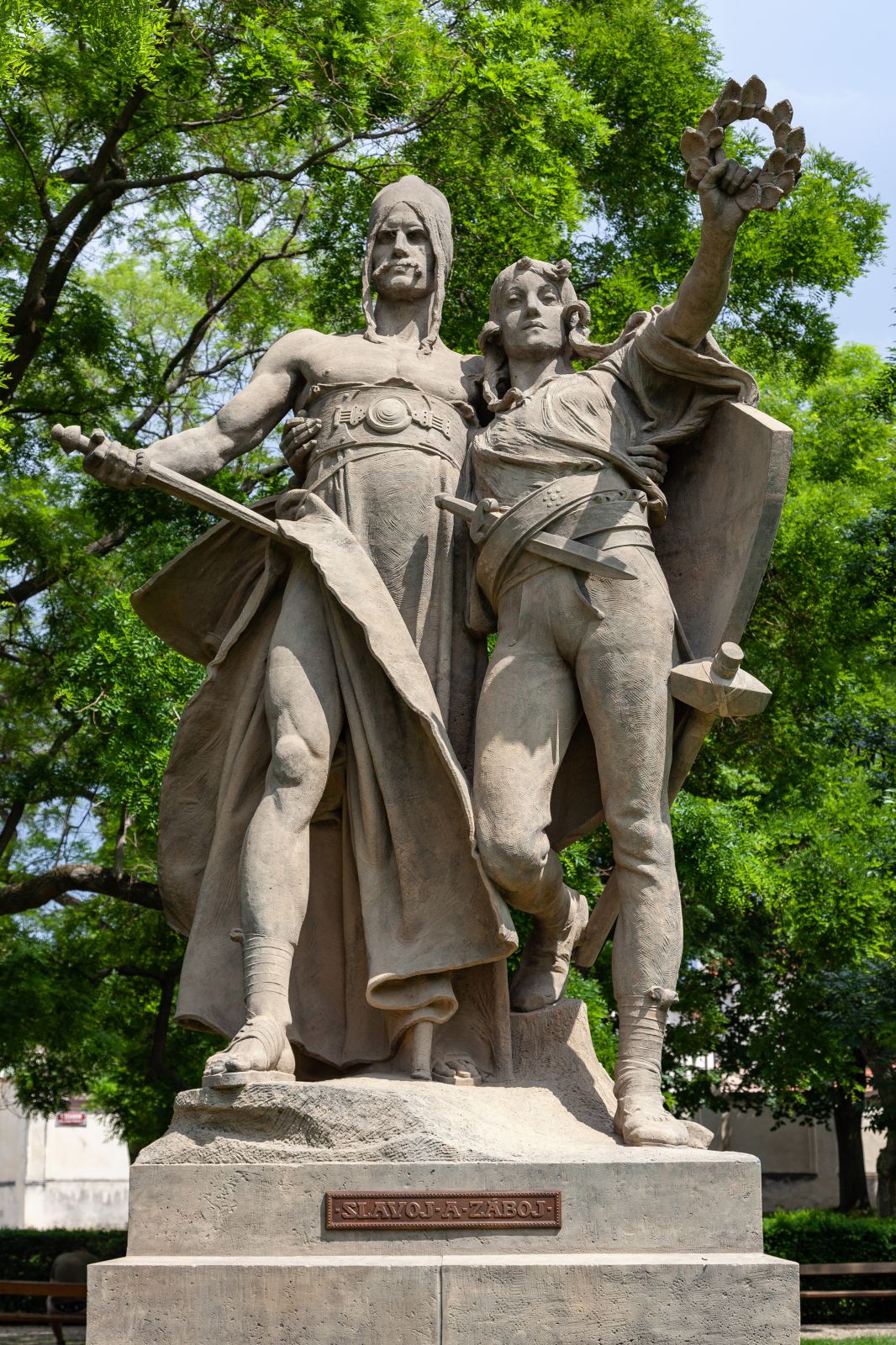 Sousoší znázorňuje dvojici bojovníků, vybájených postav básně Záboj, Slavoj i Luděk z tzv. Královédvorského rukopisu. Starší a mohutnější Záboj a mladý, docela jinošský Slavoj jsou zobrazeni ve chvílích vítězství, následujících bezprostředně po porážce nepřátelského vojska Karla Velikého, vedeného vojevůdcem Luďkem. Dvojice mužů se drží kolem pasu a hledí v heroickém, otevřeném postoji přímo vpřed. Slavoj ve své předpažené levé ruce zdvihá lipový věnec.