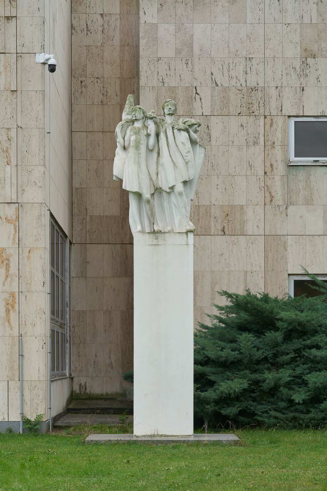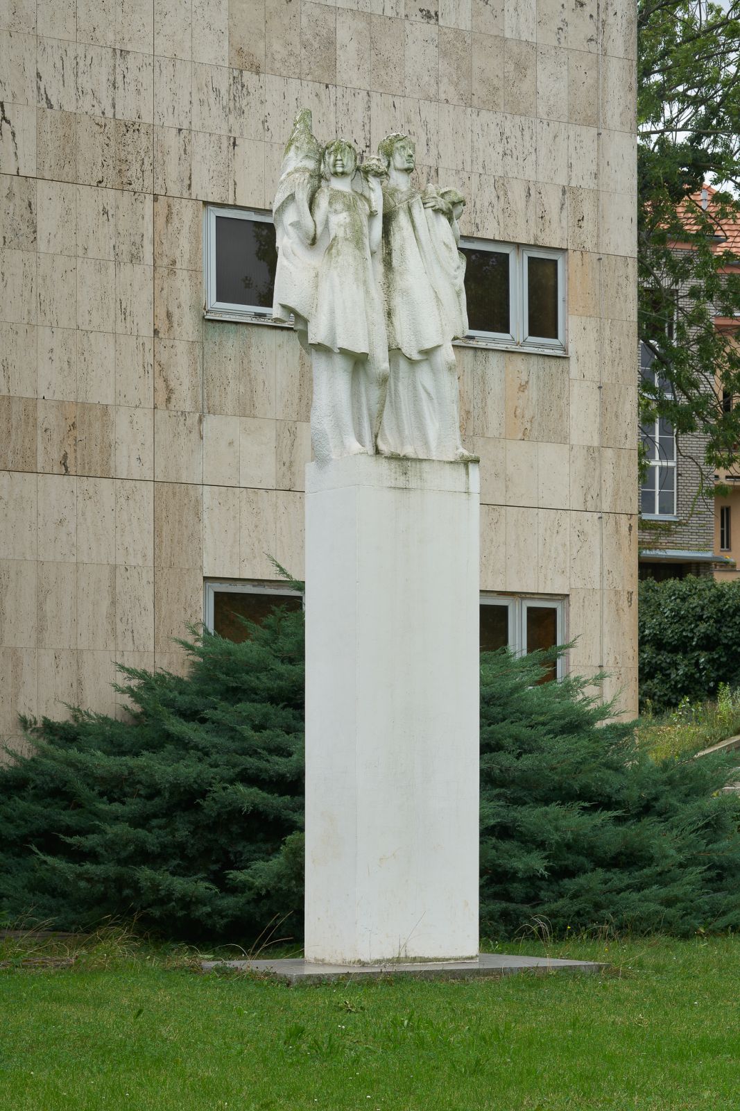 Dílo s názvem "Podíl mládeže na budování socialismu" provedl roku 1981 sochař Jiří Kryštůfek. Na převýšeném pylonovém soklu je osazena dvojice chlapce a dívky, přdržujících společně rozvinutou vlajku. Plastika i sokl byly zhotoveny z bílého vračanského vápence. Celek je osazen na desce z leštěné žuly.