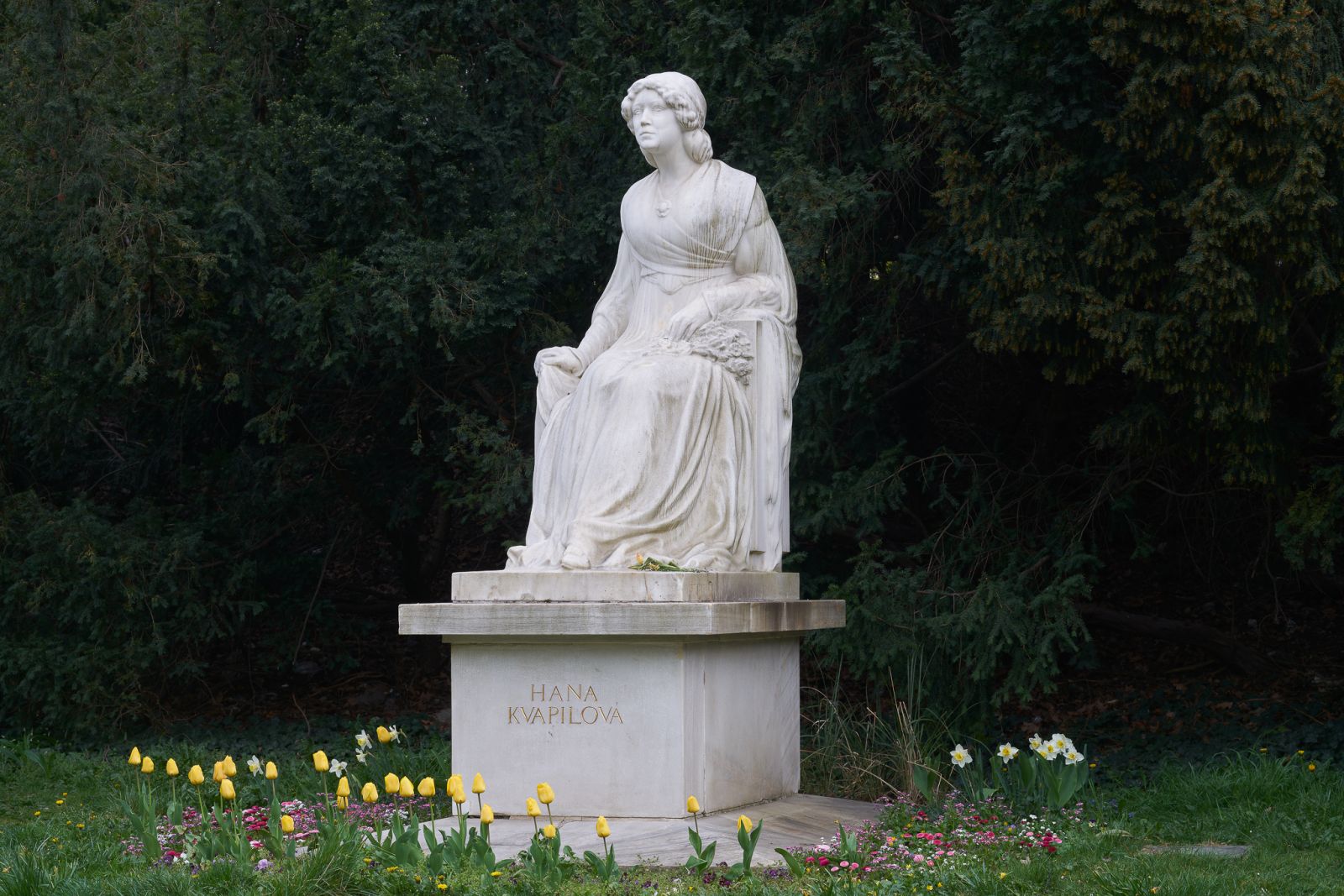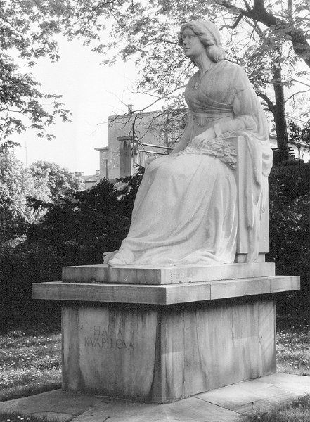 Hana Kvapilová patřila k nejvýznamnějším hereckým osobnostem své generace. Přestože zemřela v relativně mladém věku, stala se ikonou tehdejší mládeže díky své schopnosti přesvědčivě ztělesňovat soudobé ideové tendence, zejména prostřednictvím interpretací tragických hrdinek z Ibsenových a Shakespearových dramat. Její umělecký projev, často označovaný jako „herecké básnictví“, byl oceňován předními intelektuály doby, mimo jiné Františkem Xaverem Šaldou či Jiřím Karáskem ze Lvovic. Jan Štursa obdržel zakázku na vytvoření její sochařské podobizny několik let po jejím úmrtí. Úkol byl mimořádně náročný: měl ztvárnit osobnost, která již za svého života nabyla aura legendy, a zároveň splnit očekávání veřejnosti, jež si její vzhled ještě živě pamatovala. Protože Štursa herečku osobně neznal, musel při práci vycházet výhradně z fotografických pramenů a svědectví jejích přátel. Patrně i z tohoto důvodu vzniklo značné množství předběžných modelů — jak stojících, tak sedících — které předcházely finální kompozici. Definitivní socha byla vytesána z bílého tyrolského mramoru sochařem Otakarem Velinským. Zobrazuje Kvapilovou v kostýmu Ibsenovy Paní ze zámoří, její patrně nejproslulejší role. V levé ruce drží květy a pravou se opírá o opěradlo křesla, na němž je postava usazena. Úspěch Štursova pojetí dokládá i svědectví Jiřího Karáska ze Lvovic z roku 1921. Ten, ač herečku osobně znal, přiznal, že si při vzpomínkách na ni vybavuje především podobu zachycenou ve skulptuře umístěné v Kinského zahradách.