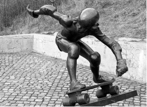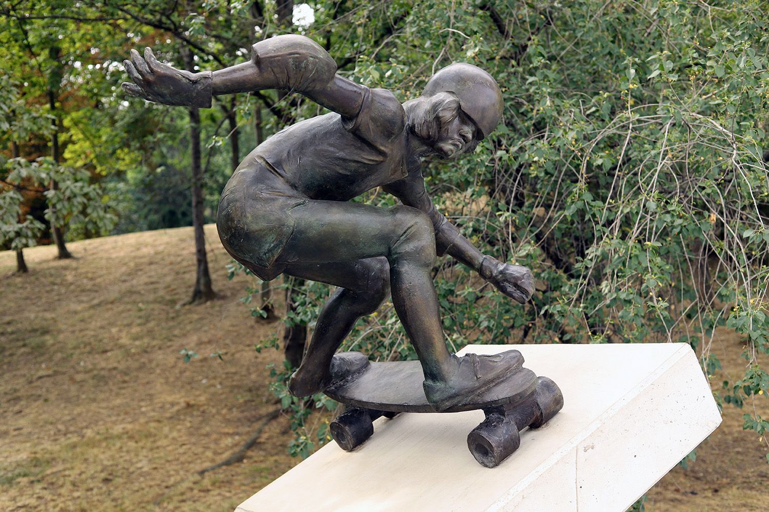 Plastika Skateboardista (v dobových záznamech uváděna pod názvem Kluk) byla u nově vybudovaného skate parku znovuosazena v srpnu roku 2022. Plastika byla v roce 2008 po poškození (uřezání rukou sběrači kovů) demontována a uložena v depozitáři. V roce 2021 byla za účasti autora zrestaurována a byly doplněny znovu vymodelované ruce. Na opravu plastiky byla vypsána veřejná sbírka ve které byla vybráno 250 000 Kč. Jedná se o první sochu zobrazující skateboarding na světě.